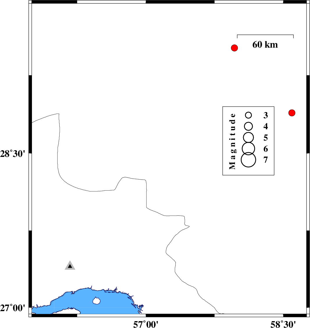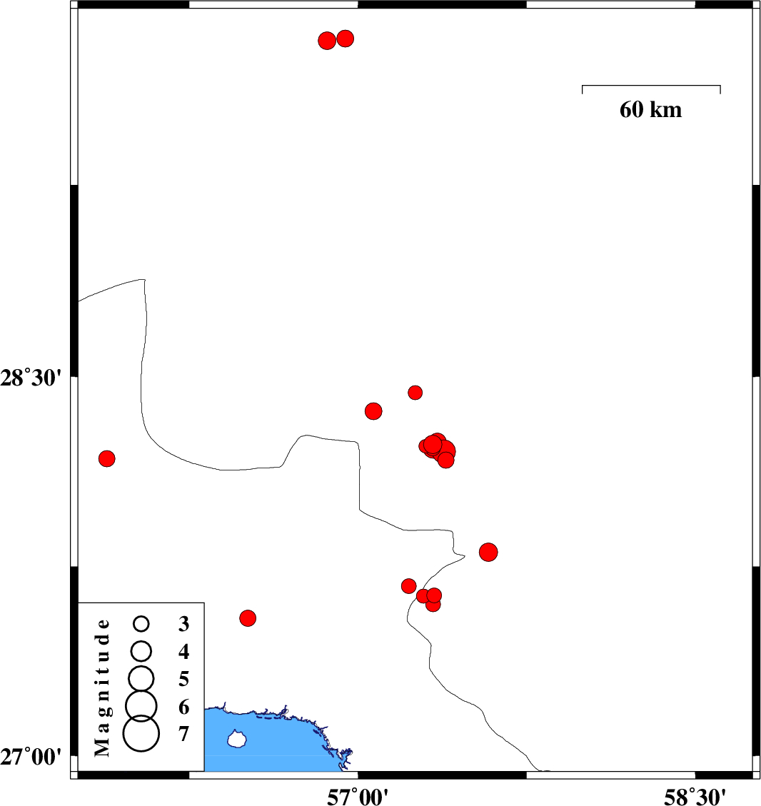 | 2016/12/28 | 06:20:52.4 | 09:50:52.4 | 27.807 | 57.58 | 14 | ML3.7 | Kerman Province, 19 km South-West of Kahnuj | ||