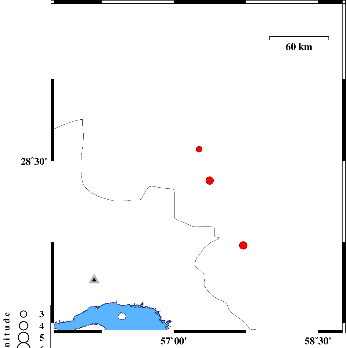 | 2016/12/28 | 06:20:52.4 | 09:50:52.4 | 27.807 | 57.58 | 14 | ML3.7 | Kerman Province, 19 km South-West of Kahnuj |