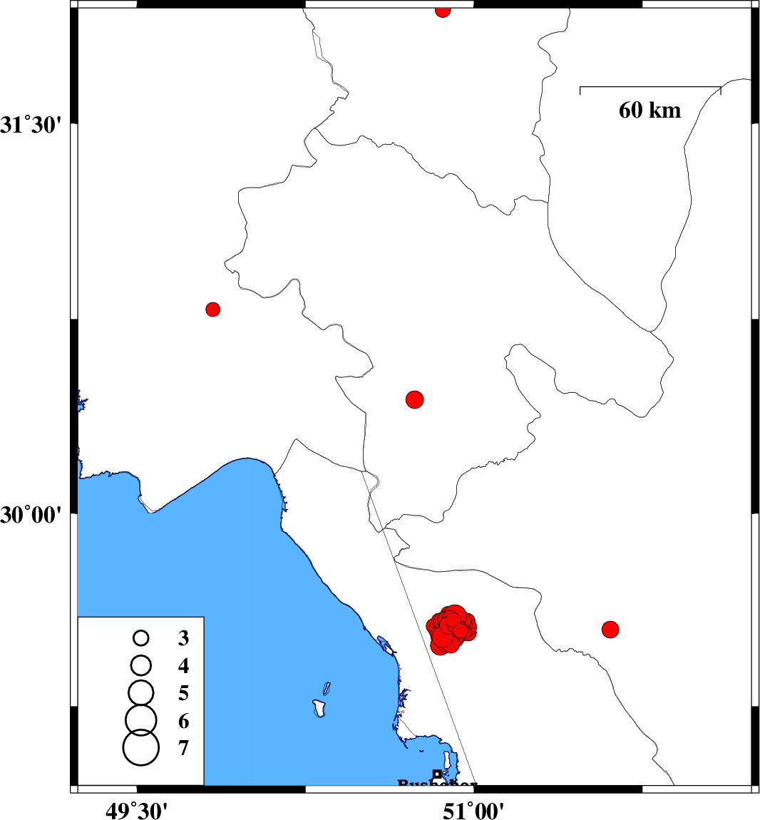 | 2017/01/02 | 00:38:12.2 | 04:08:12.2 | 29.584 | 50.883 | 6 | ML3.9 | Bushehr Province, 36 km -East of Bandar-e genaveh | ||