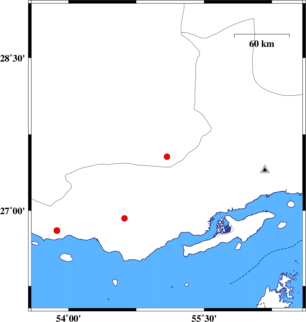 | 2017/01/03 | 14:14:13.3 | 17:44:13.3 | 26.923 | 54.62 | 17 | ML3 | Hormozgan Province, 40 km South-East of Bastak | ||