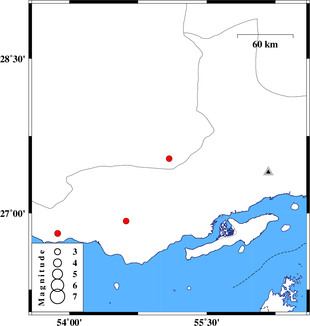 | 2017/01/07 | 23:29:11.6 | 02:59:11.6 | 27.531 | 55.089 | 17 | ML2.9 | Fars Province, 76 km South-East of Lar | ||