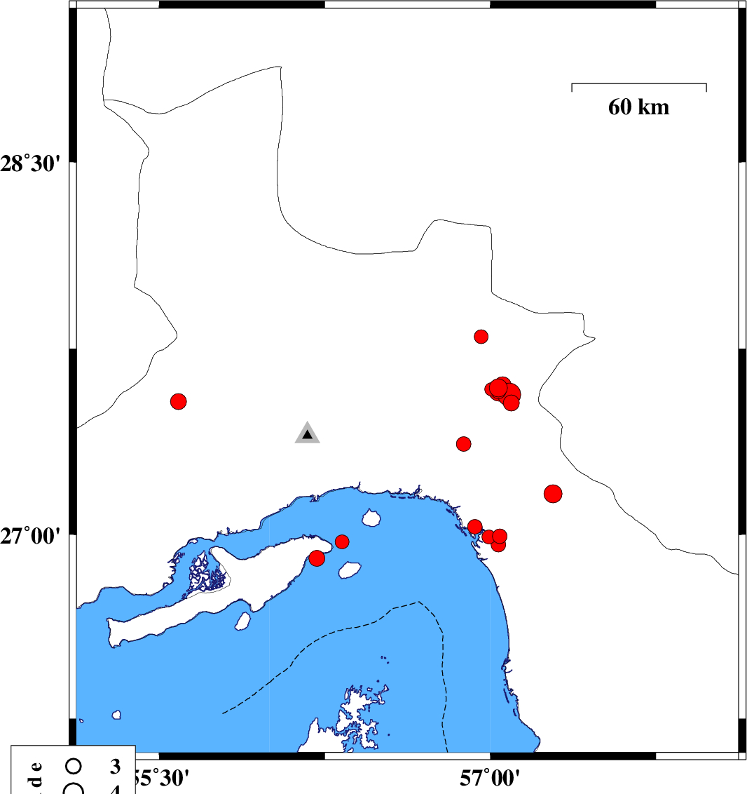 2016/12/27 | 02:44:51.1 | 06:14:51.1 | 26.596 | 56.951 | 18 | ML3 | Oman Sea, 63 km South-West of Minab | ||