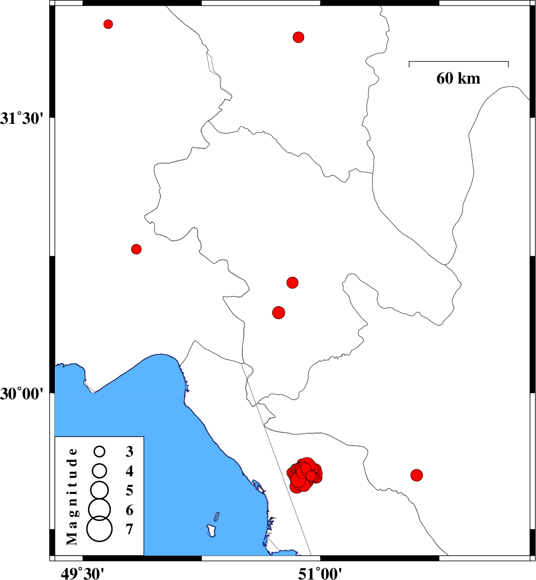 | 2017/01/02 | 00:38:12.2 | 04:08:12.2 | 29.584 | 50.883 | 6 | ML3.9 | Bushehr Province, 36 km -East of Bandar-e genaveh | ||