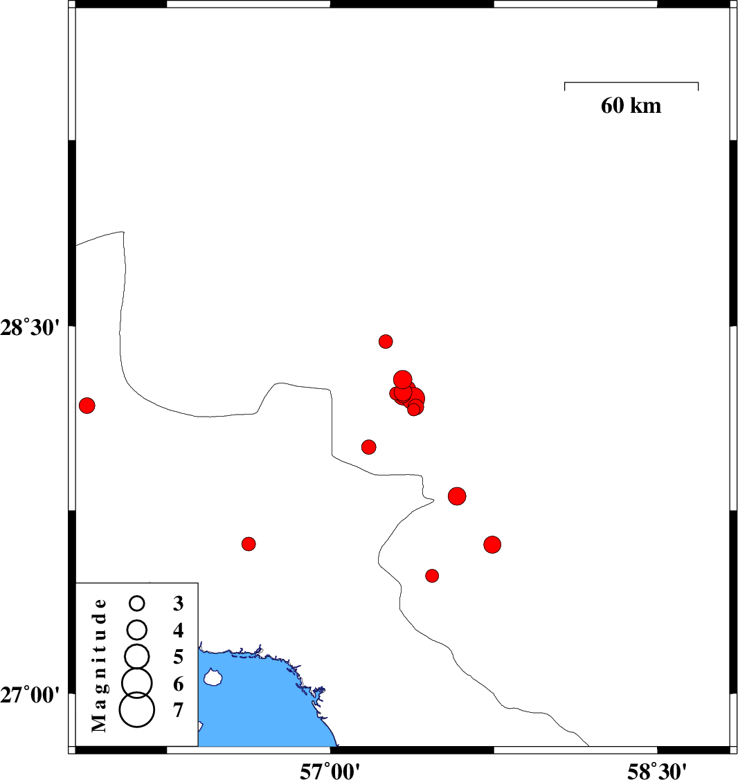 | 2016/12/28 | 06:20:52.4 | 09:50:52.4 | 27.807 | 57.58 | 14 | ML3.7 | Kerman Province, 19 km South-West of Kahnuj | ||