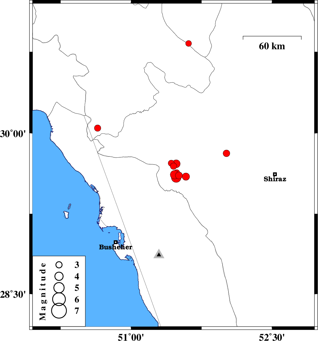 | 2017/01/19 | 05:33:12.4 | 09:03:12.4 | 29.596 | 51.584 | 9 | ML3.5 | Fars Province, 7 km of Kazerun | ||