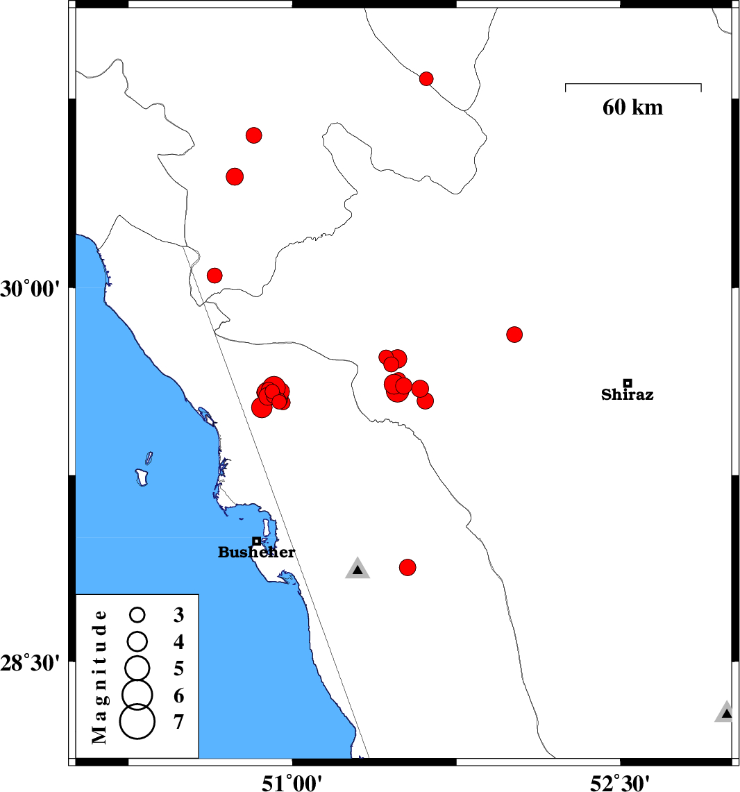 | 2017/01/02 | 00:38:12.2 | 04:08:12.2 | 29.584 | 50.883 | 6 | ML3.9 | Bushehr Province, 36 km -East of Bandar-e genaveh | ||