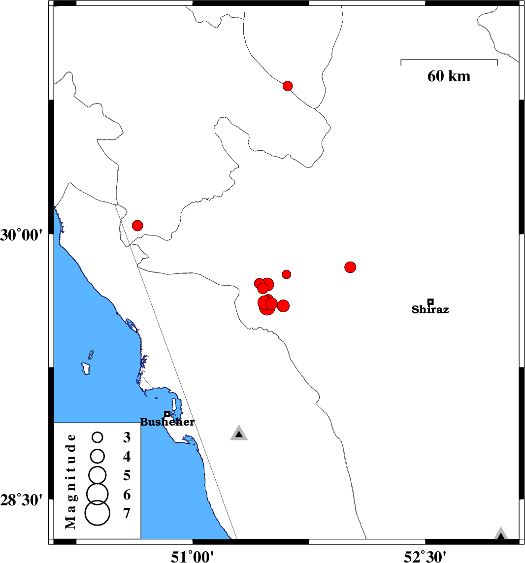 | 2017/01/14 | 04:52:18.4 | 08:22:18.4 | 29.716 | 51.48 | 15 | ML3.8 | Fars Province, 20 km -West of Kazerun |