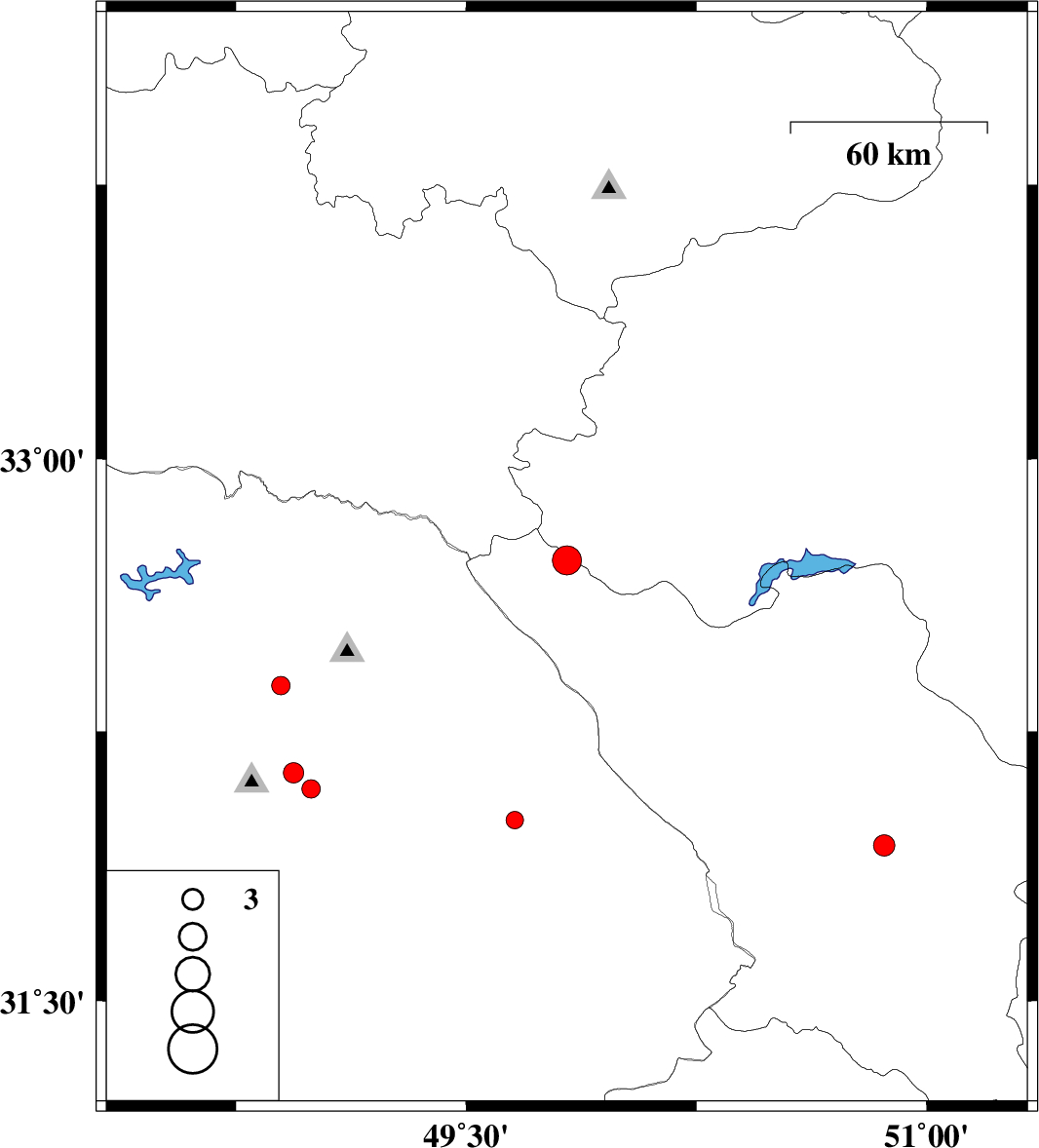 | 2017/01/22 | 06:47:38.7 | 10:17:38.7 | 32.721 | 49.828 | 15 | ML4.3 | Chaharmahal Bakhtiari Province, 36 km South-West of Fereydunshahr | ||