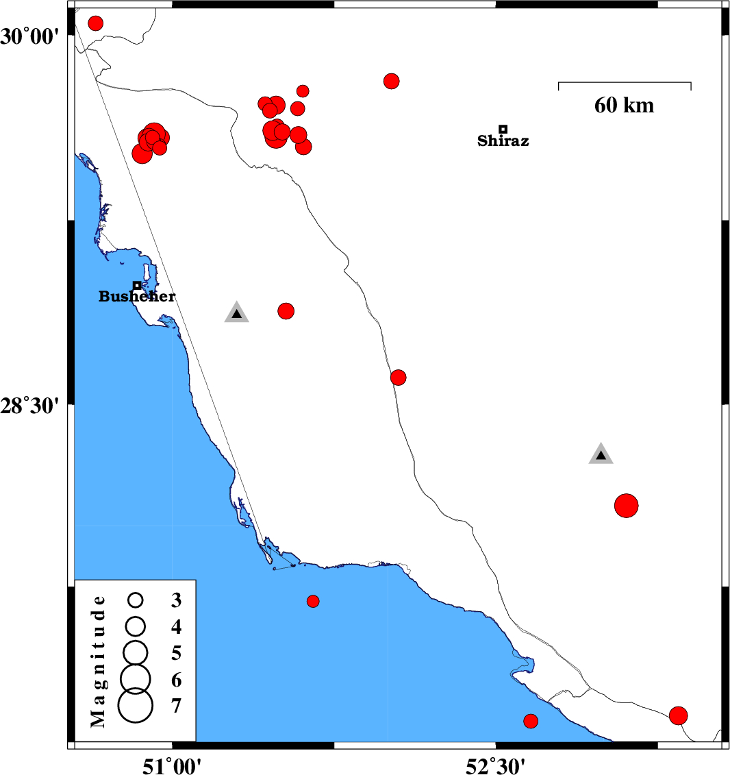 2017/01/02 | 00:38:12.2 | 04:08:12.2 | 29.584 | 50.883 | 6 | ML3.9 | Bushehr Province, 36 km -East of Bandar-e genaveh | ||