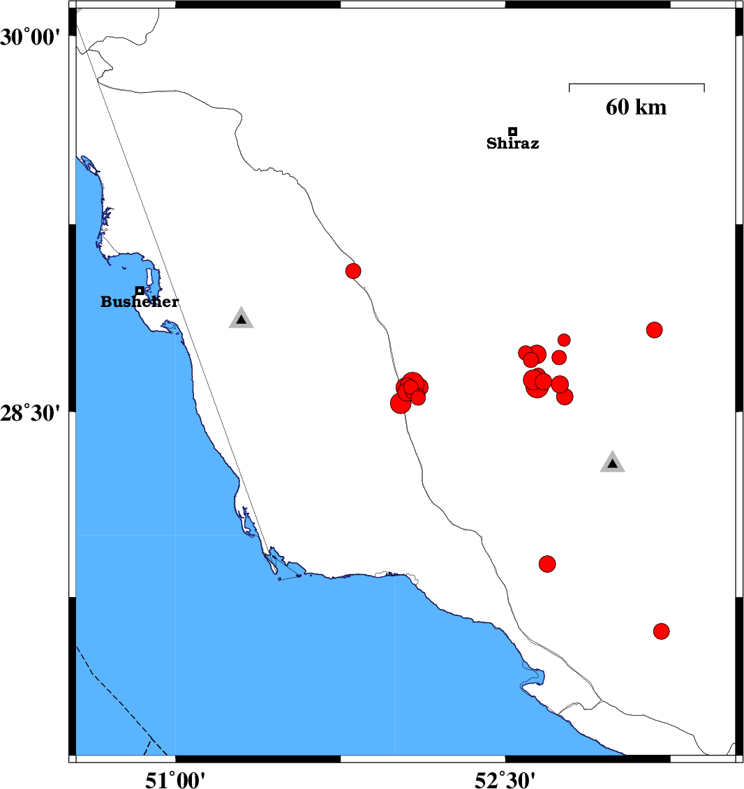 | 2017/01/02 | 06:43:01.6 | 10:13:01.6 | 29.566 | 50.887 | 6 | ML3.6 | Bushehr Province, 36 km -East of Bandar-e genaveh | ||