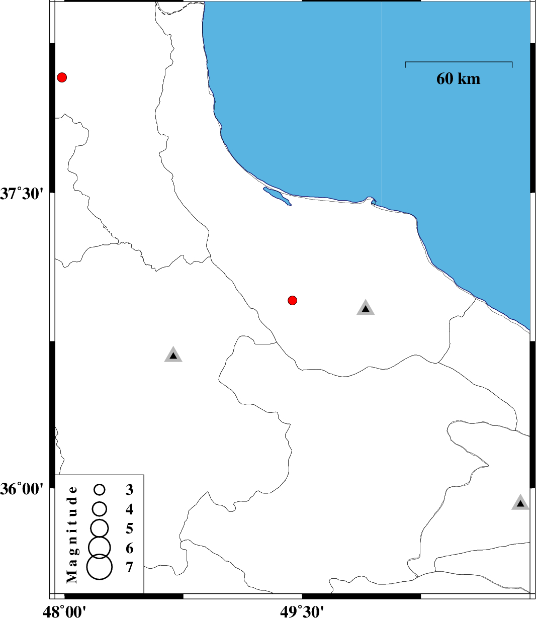 | 2017/01/24 | 08:54:09.7 | 12:24:09.7 | 36.956 | 49.438 | 15 | ML2.6 | Gilan Province, 15 km North of Rudbar | ||