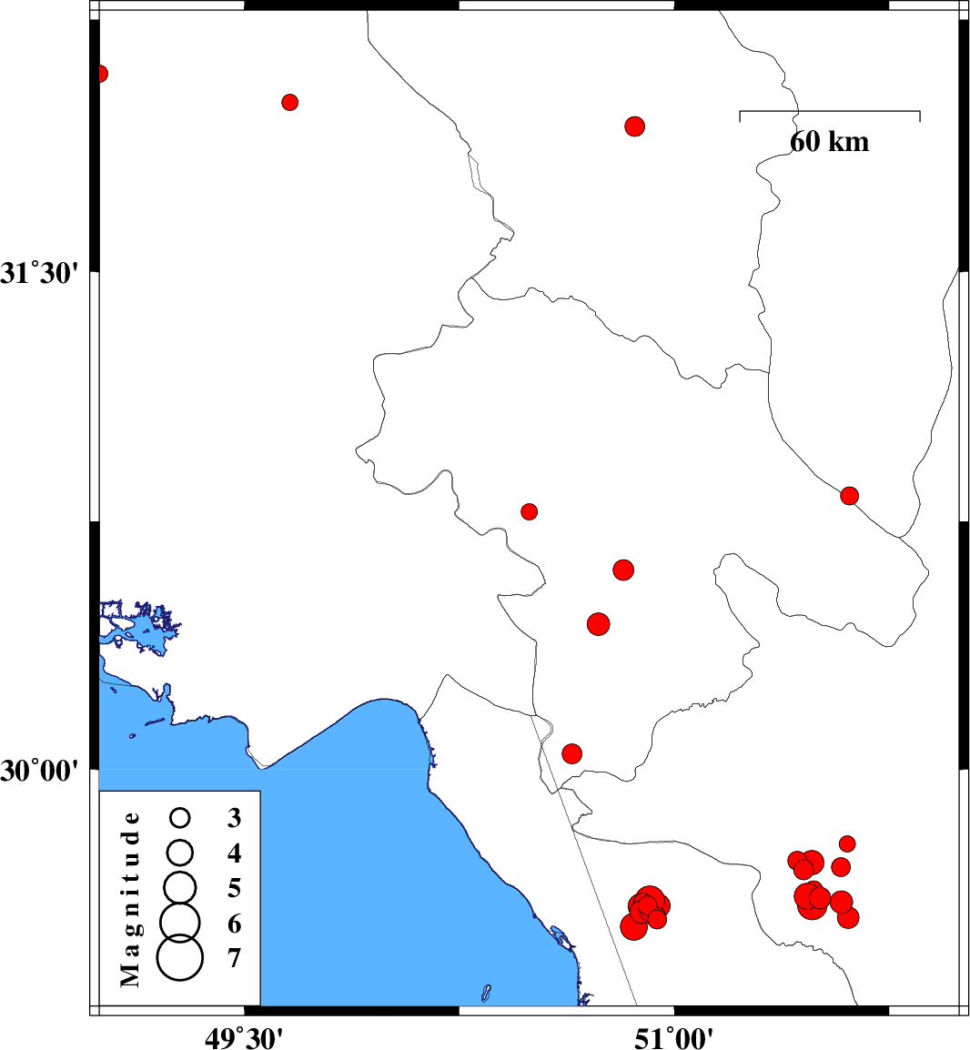 | 2017/01/02 | 00:38:12.2 | 04:08:12.2 | 29.584 | 50.883 | 6 | ML3.9 | Bushehr Province, 36 km -East of Bandar-e genaveh | ||