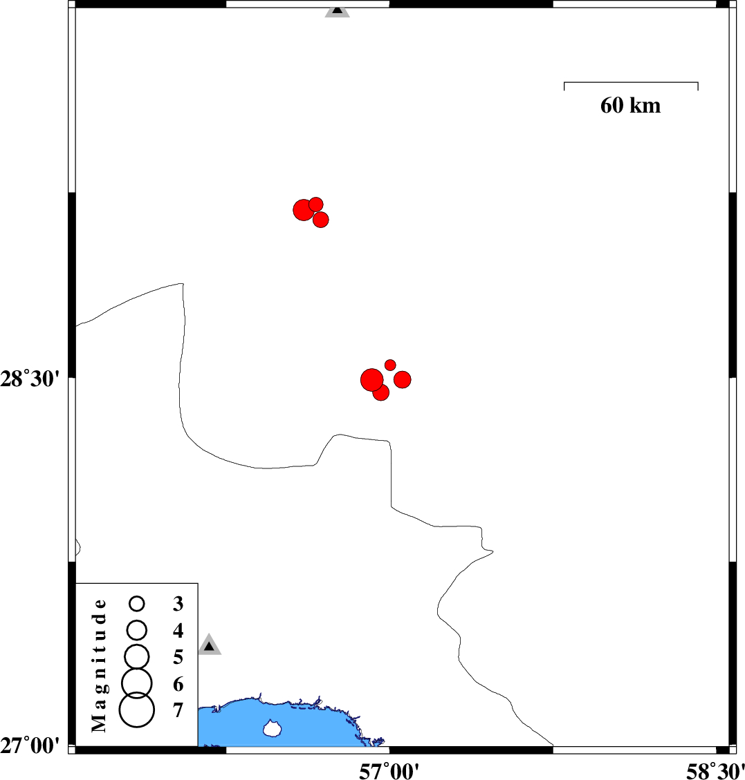 2017/01/25 | 12:36:47.1 | 16:06:47.1 | 28.551 | 57.003 | 14 | ML2.2 | Kerman Province, 73 km South-West of Jiroft | ||