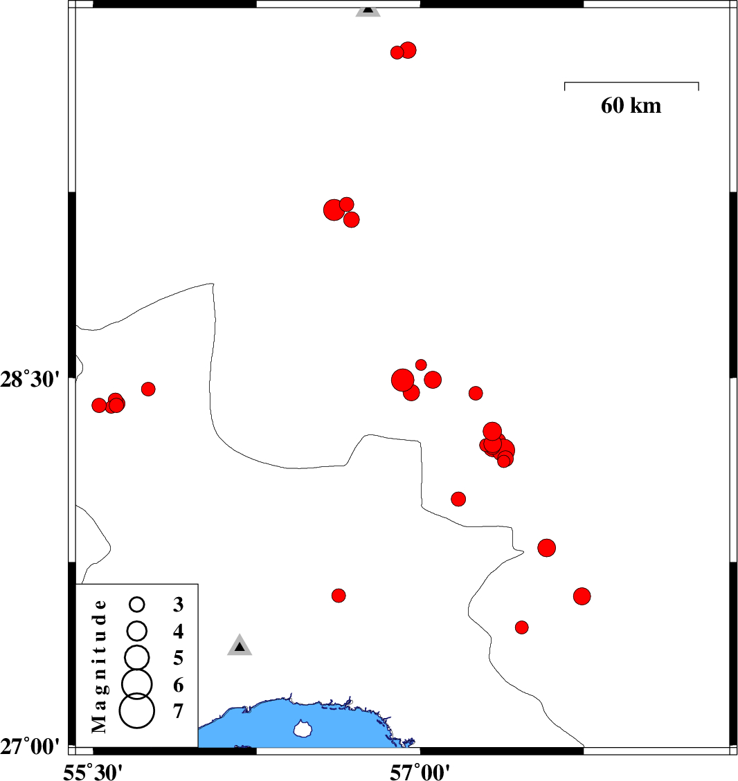 | 2016/12/28 | 06:20:52.4 | 09:50:52.4 | 27.807 | 57.58 | 14 | ML3.7 | Kerman Province, 19 km South-West of Kahnuj | ||