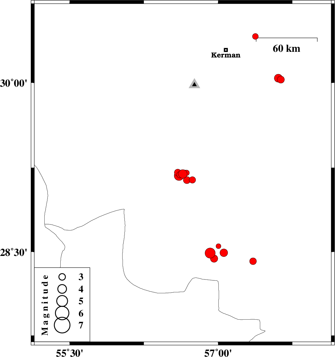 | 2017/01/25 | 12:36:47.1 | 16:06:47.1 | 28.551 | 57.003 | 14 | ML2.2 | Kerman Province, 73 km South-West of Jiroft | ||