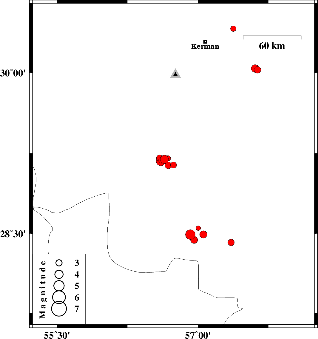 | 2017/01/25 | 12:36:47.1 | 16:06:47.1 | 28.551 | 57.003 | 14 | ML2.2 | Kerman Province, 73 km South-West of Jiroft | ||