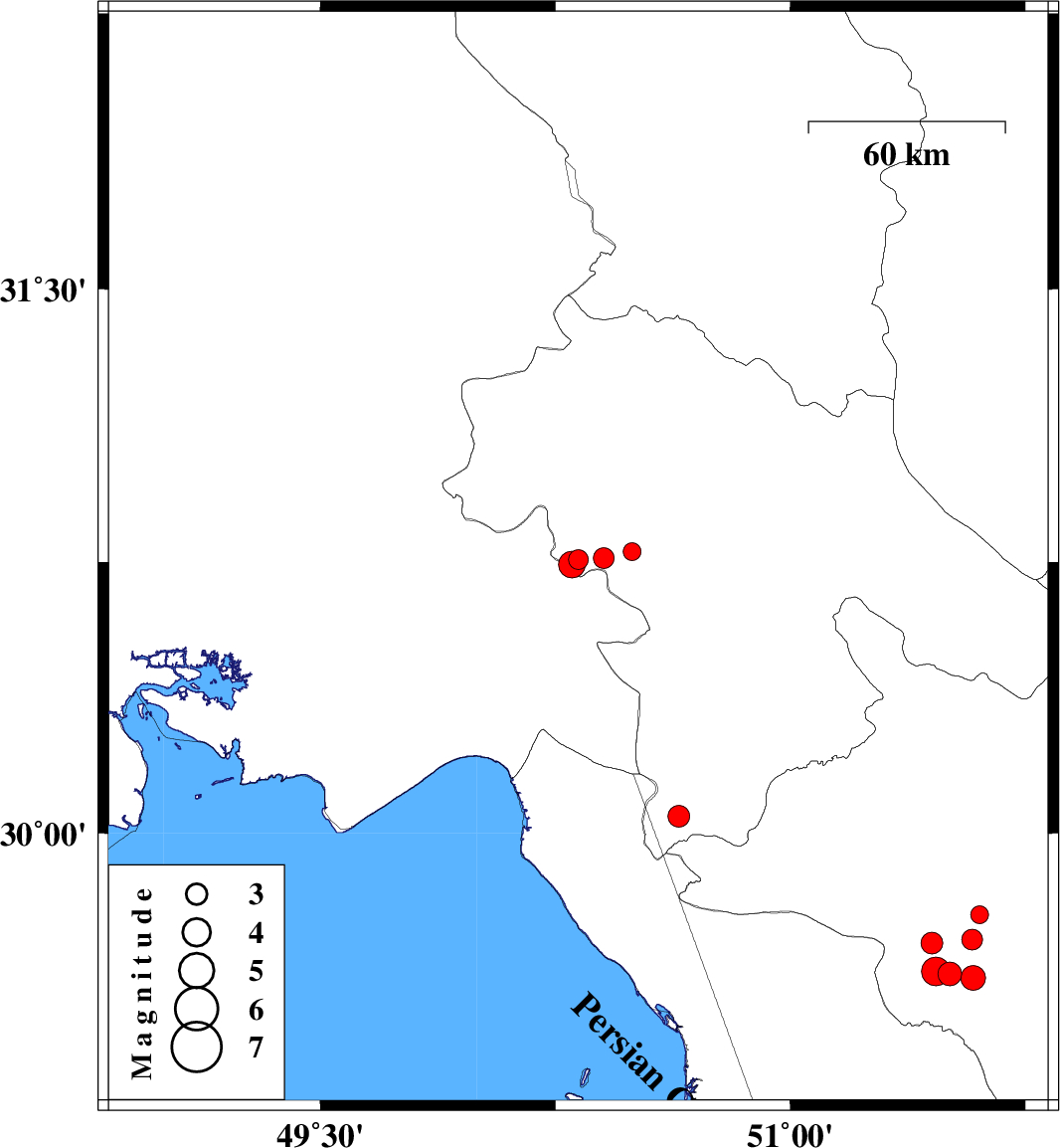 | 2017/01/26 | 07:48:15.5 | 11:18:15.5 | 30.743 | 50.302 | 15 | ML3.8 | Kohkiluieh va boyerahmad Province, 17 km North of Behbahan | ||