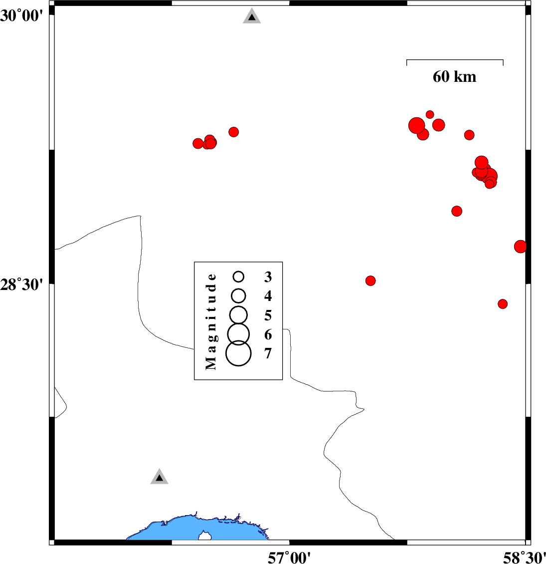 | 2017/01/25 | 12:36:47.1 | 16:06:47.1 | 28.551 | 57.003 | 14 | ML2.2 | Kerman Province, 73 km South-West of Jiroft | ||