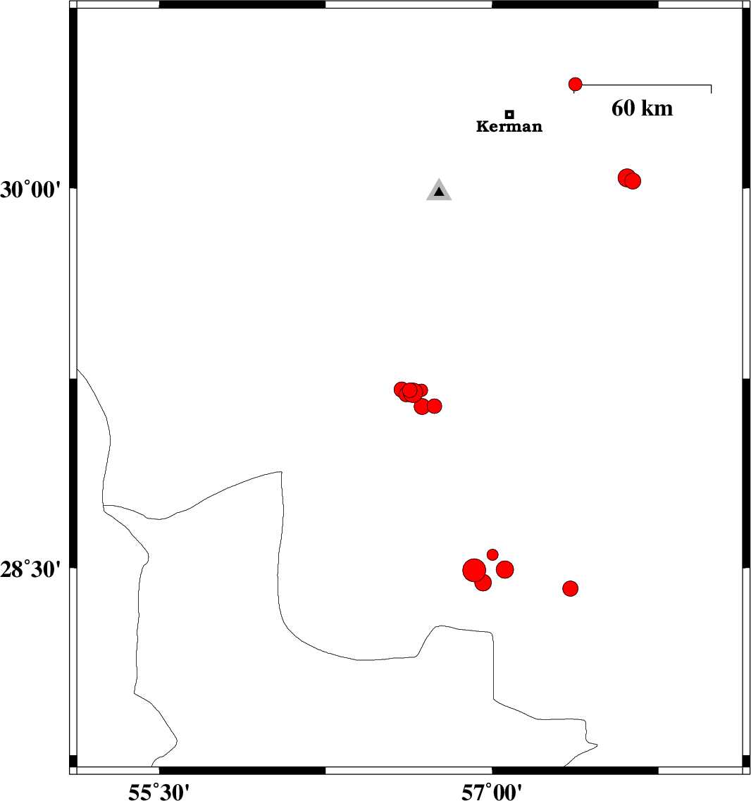 | 2017/01/25 | 12:36:47.1 | 16:06:47.1 | 28.551 | 57.003 | 14 | ML2.2 | Kerman Province, 73 km South-West of Jiroft | ||