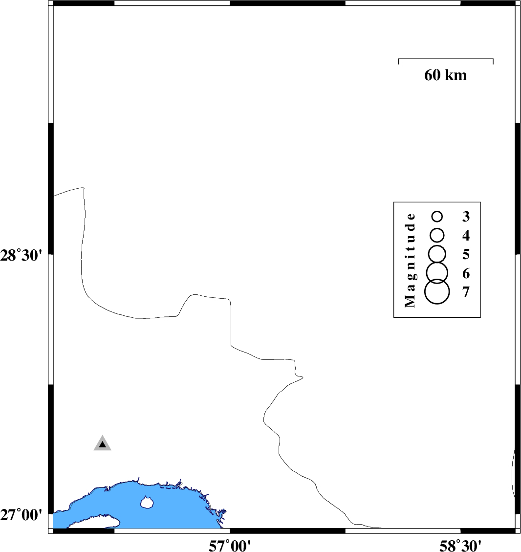 | 2017/01/25 | 12:36:47.1 | 16:06:47.1 | 28.551 | 57.003 | 14 | ML2.2 | Kerman Province, 73 km South-West of Jiroft | ||