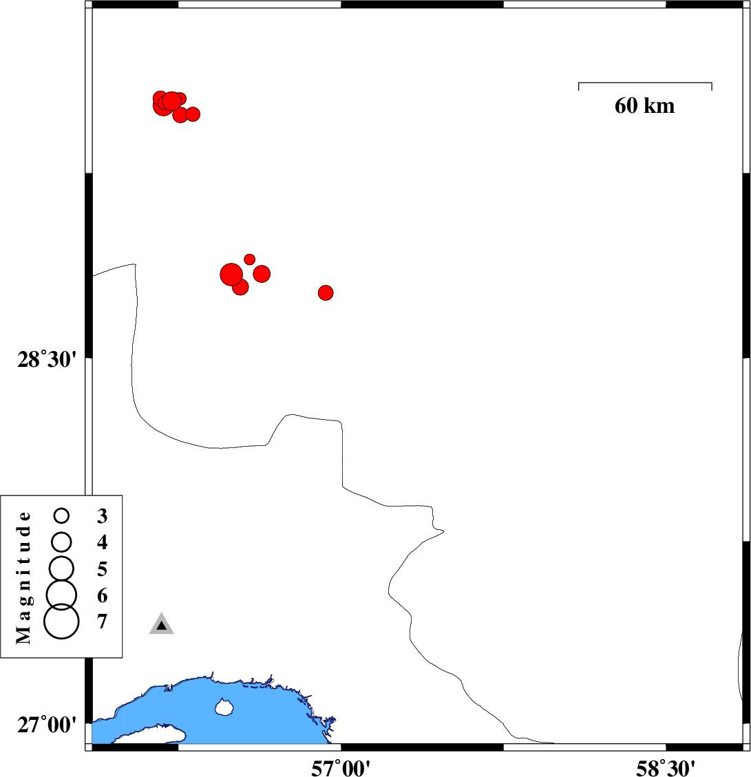| 2017/01/25 | 12:36:47.1 | 16:06:47.1 | 28.551 | 57.003 | 14 | ML2.2 | Kerman Province, 73 km South-West of Jiroft | ||