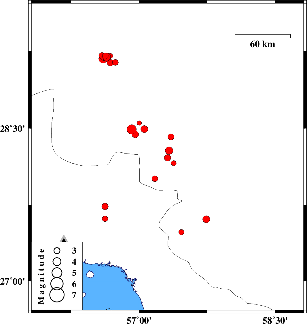| 2017/01/09 | 08:12:00.6 | 11:42:00.6 | 28.007 | 57.175 | 16 | ML2.9 | Kerman Province, 51 km -West of Kahnuj |