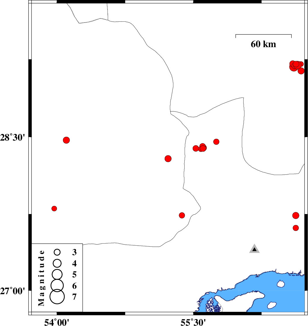 | 2017/01/10 | 17:28:04.7 | 20:58:04.7 | 27.613 | 56.625 | 17 | ML2.8 | Hormozgan Province, 59 km North-East of Bandar-e abbas |