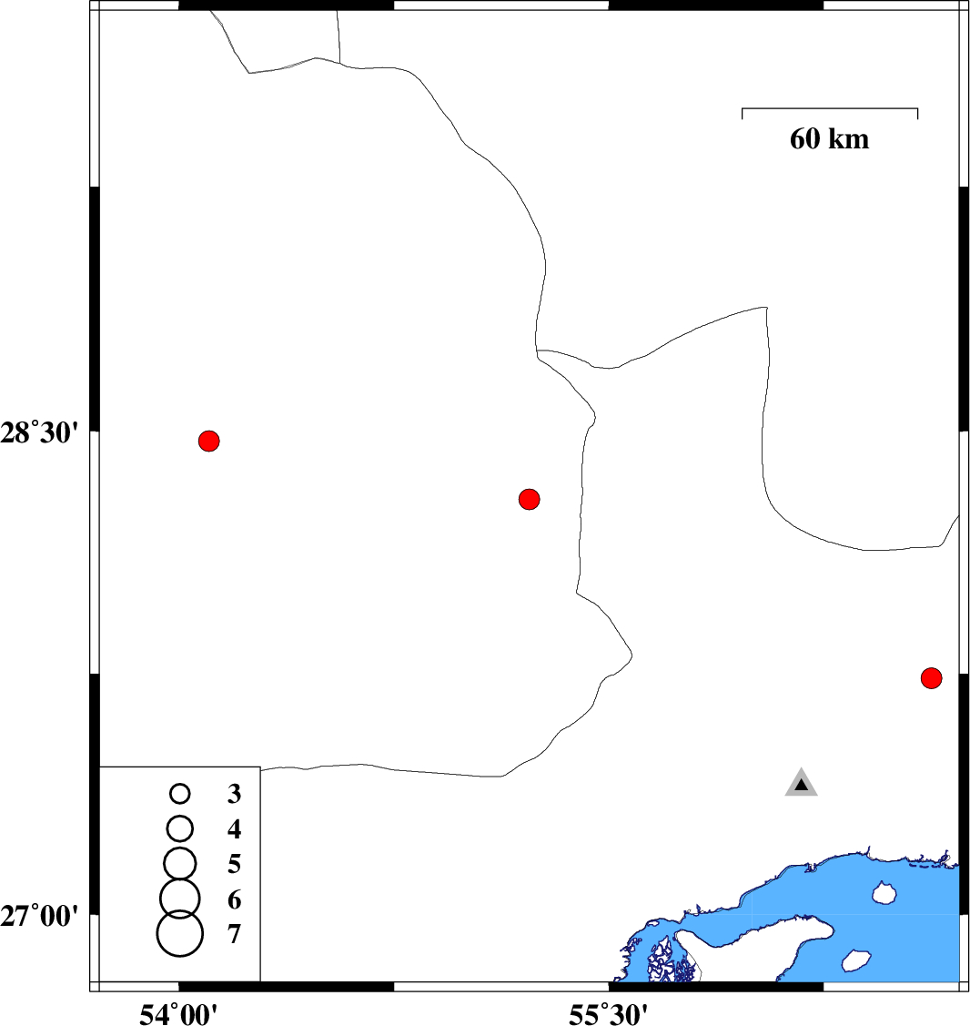 2017/02/03 | 15:33:52.3 | 19:03:52.3 | 27.735 | 56.626 | 14 | ML3.3 | Hormozgan Province, 70 km North-East of Bandar-e abbas |