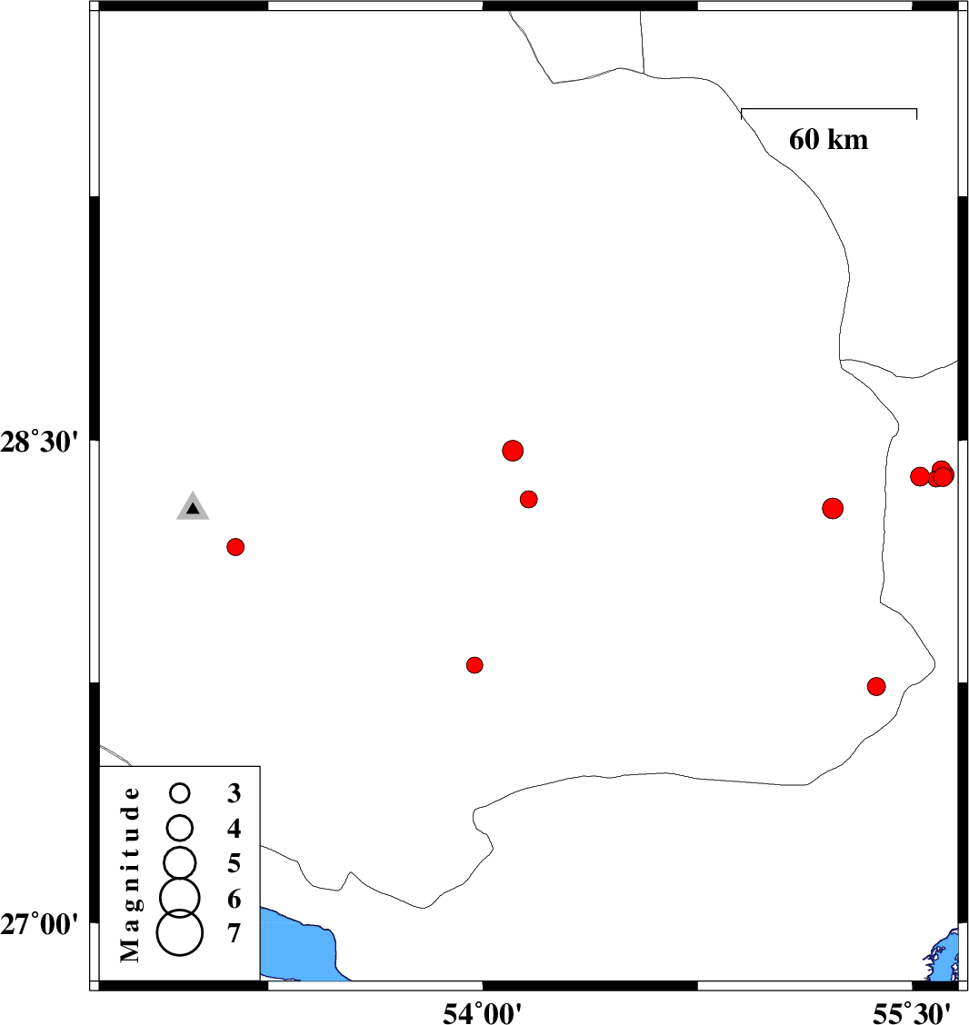| 2017/02/02 | 21:58:08.3 | 01:28:08.3 | 28.17 | 53.136 | 6 | ML2.7 | Fars Province, 34 km South-East of Qir va Karzin | ||