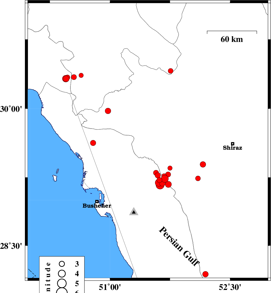 2017/01/20 | 04:48:21.9 | 08:18:21.9 | 29.694 | 51.452 | 15 | ML3.1 | Fars Province, 21 km -West of Kazerun | ||