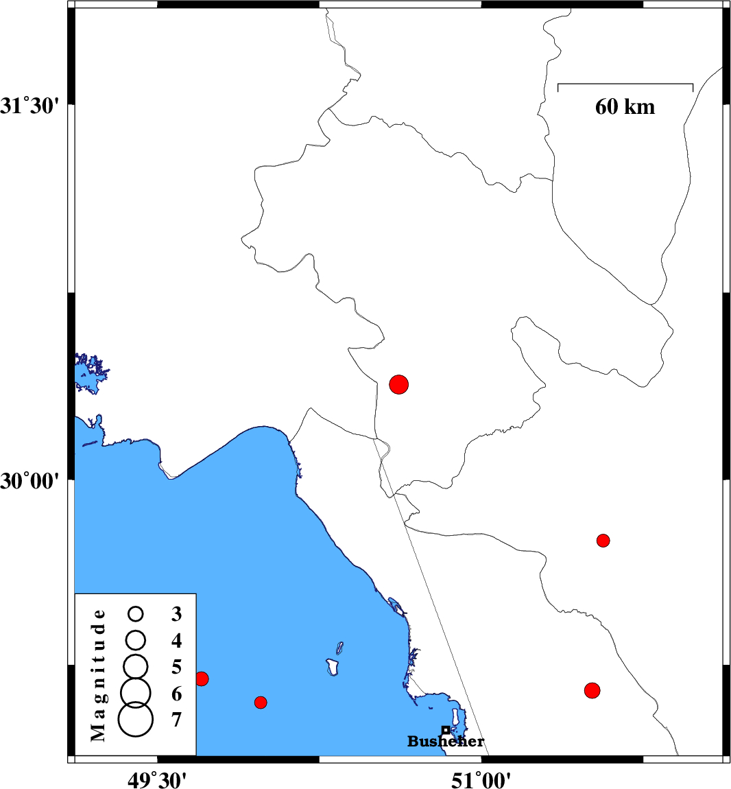 | 2017/02/24 | 03:47:59.1 | 07:17:59.1 | 29.146 | 51.514 | 14 | ML3.3 | Bushehr Province, 33 km South-East of Borazjan |
