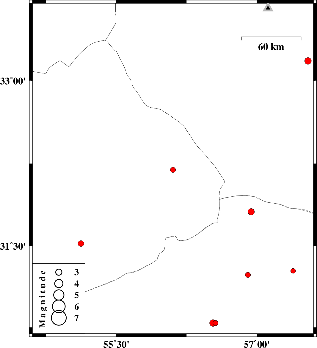 | 2017/01/31 | 10:49:40.6 | 14:19:40.6 | 31.234 | 56.906 | 14 | ML2.6 | Kerman Province, 10 km of Ravar |