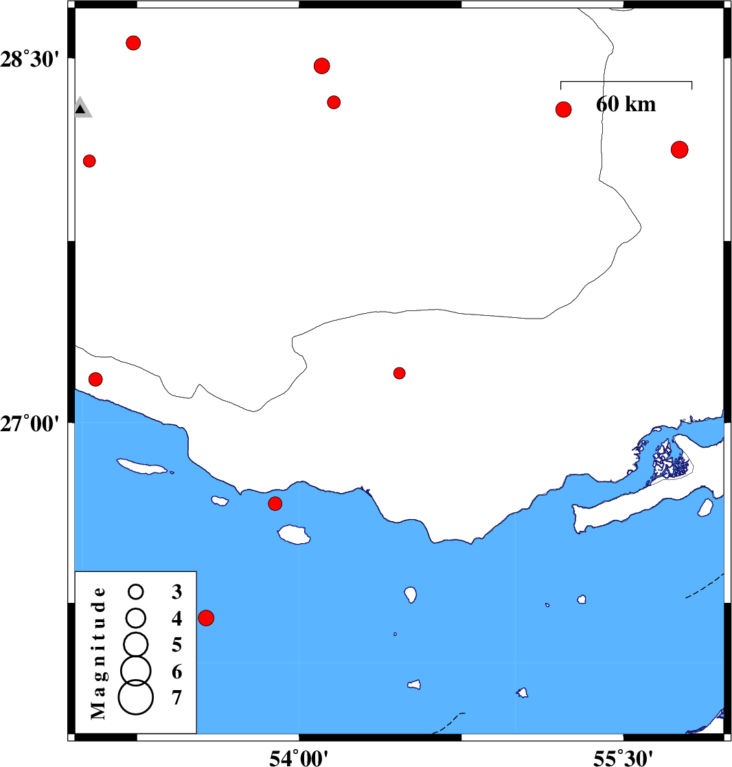 | 2017/02/09 | 02:06:11.6 | 05:36:11.6 | 27.179 | 53.058 | 14 | ML2.8 | Hormozgan Province, 20 km South-West of Lamerd |