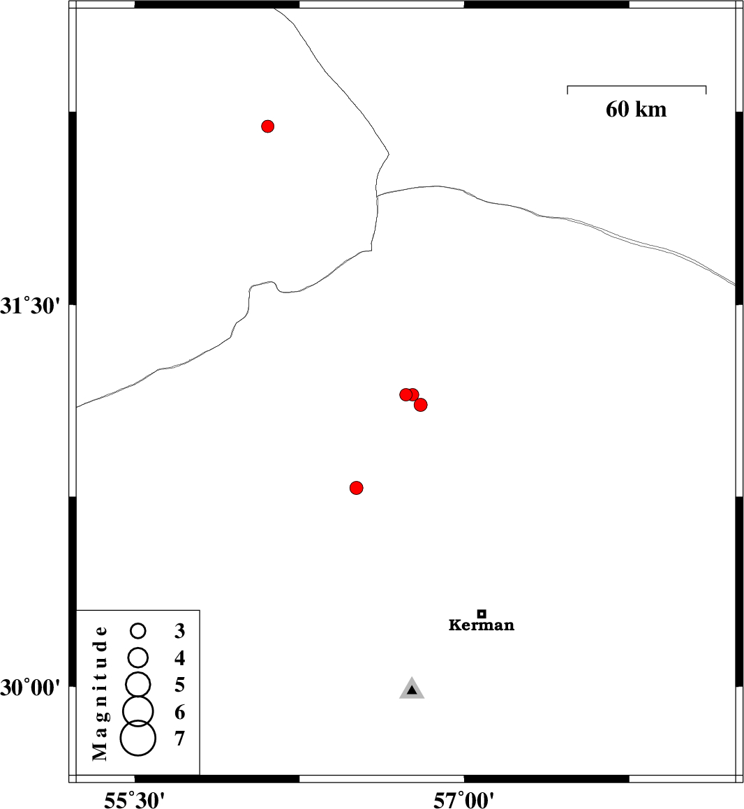 | 2017/03/04 | 19:36:56.2 | 23:06:56.2 | 31.149 | 56.765 | 14 | ML2.5 | Kerman Province, 14 km South of Ravar | ||