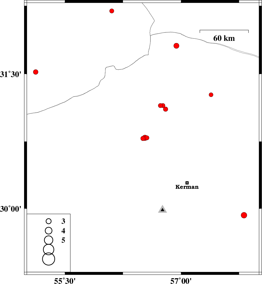 2017/03/05 | 03:20:30.6 | 06:50:30.6 | 31.109 | 56.801 | 16 | ML:2.7 | Kerman Province, 17 km South of Ravar | ||
