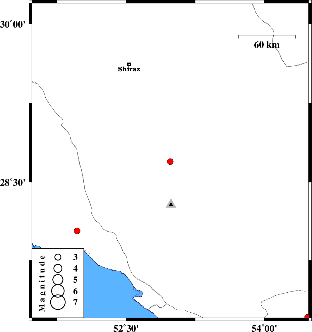 | 2017/03/12 | 16:32:20.6 | 20:02:20.6 | 28.696 | 52.979 | 14 | ML2.9 | Fars Province, 26 km North of Qir va Karzin | ||