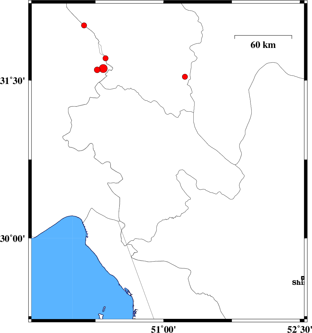 | 2017/02/26 | 11:49:40.9 | 15:19:40.9 | 29.754 | 51.564 | 14 | ML2.7 | Fars Province, 17 km North of Kazerun | ||