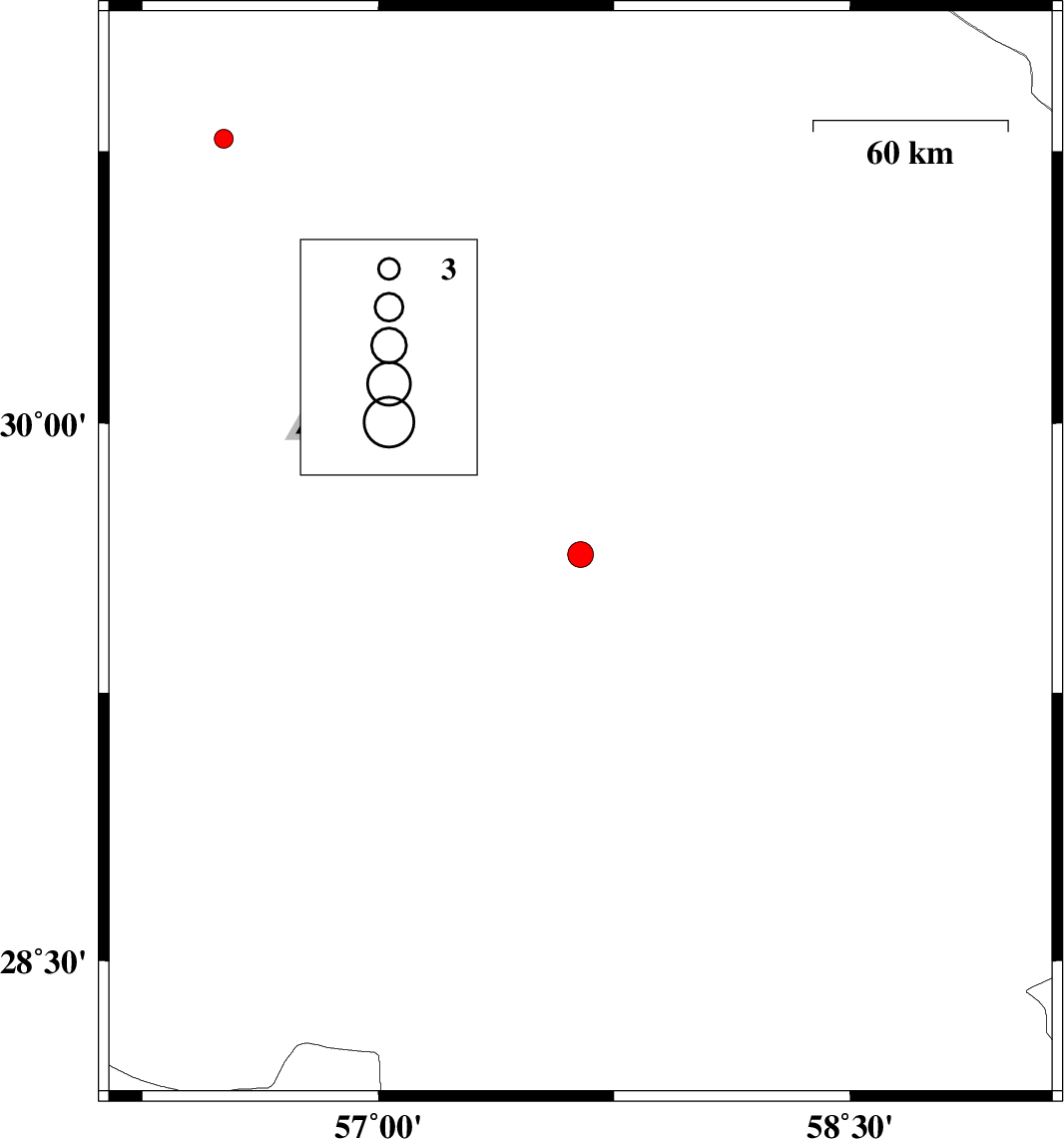 | 2017/03/16 | 12:29:22.6 | 15:59:22.6 | 29.635 | 57.643 | 14 | ML3.7 | Kerman Province, 108 km North of Jiroft | ||