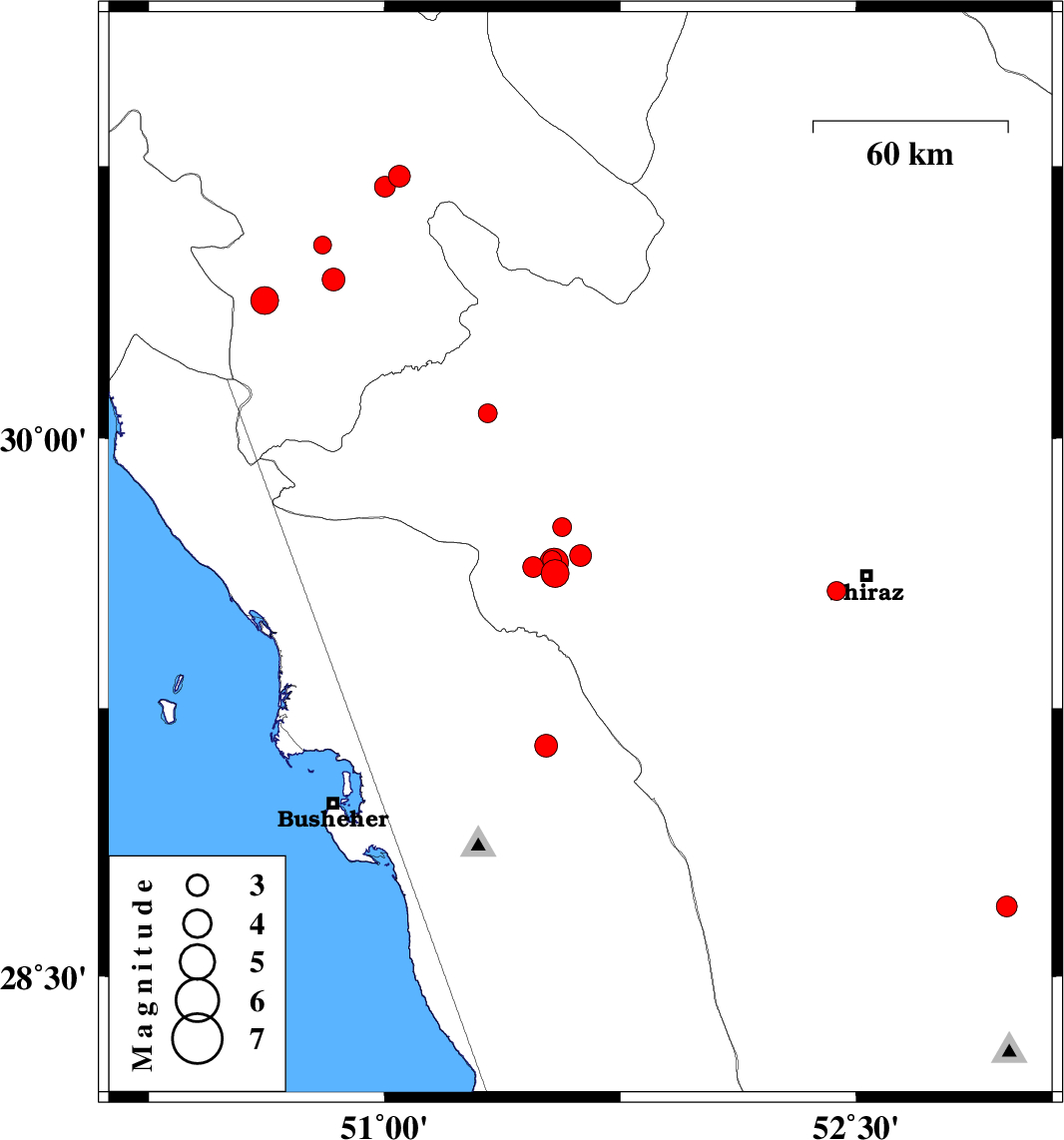 | 2017/02/24 | 03:47:59.1 | 07:17:59.1 | 29.146 | 51.514 | 14 | ML3.3 | Bushehr Province, 33 km South-East of Borazjan | ||
