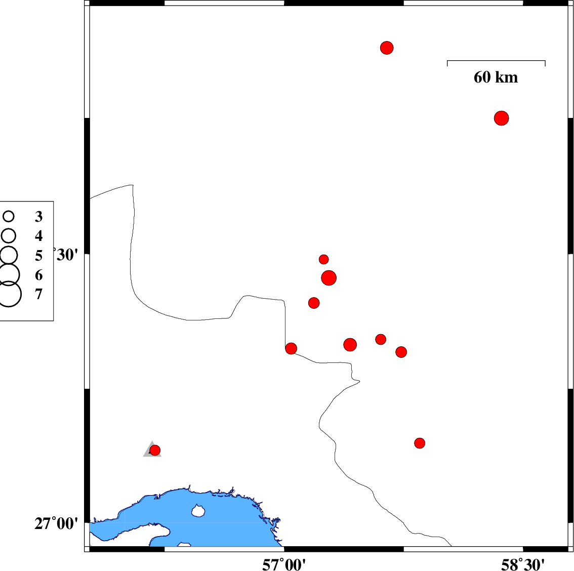 2017/03/08 | 05:00:11.1 | 08:30:11.1 | 28.227 | 57.187 | 16 | ML3.1 | Kerman Province, 59 km North-West of Kahnuj |