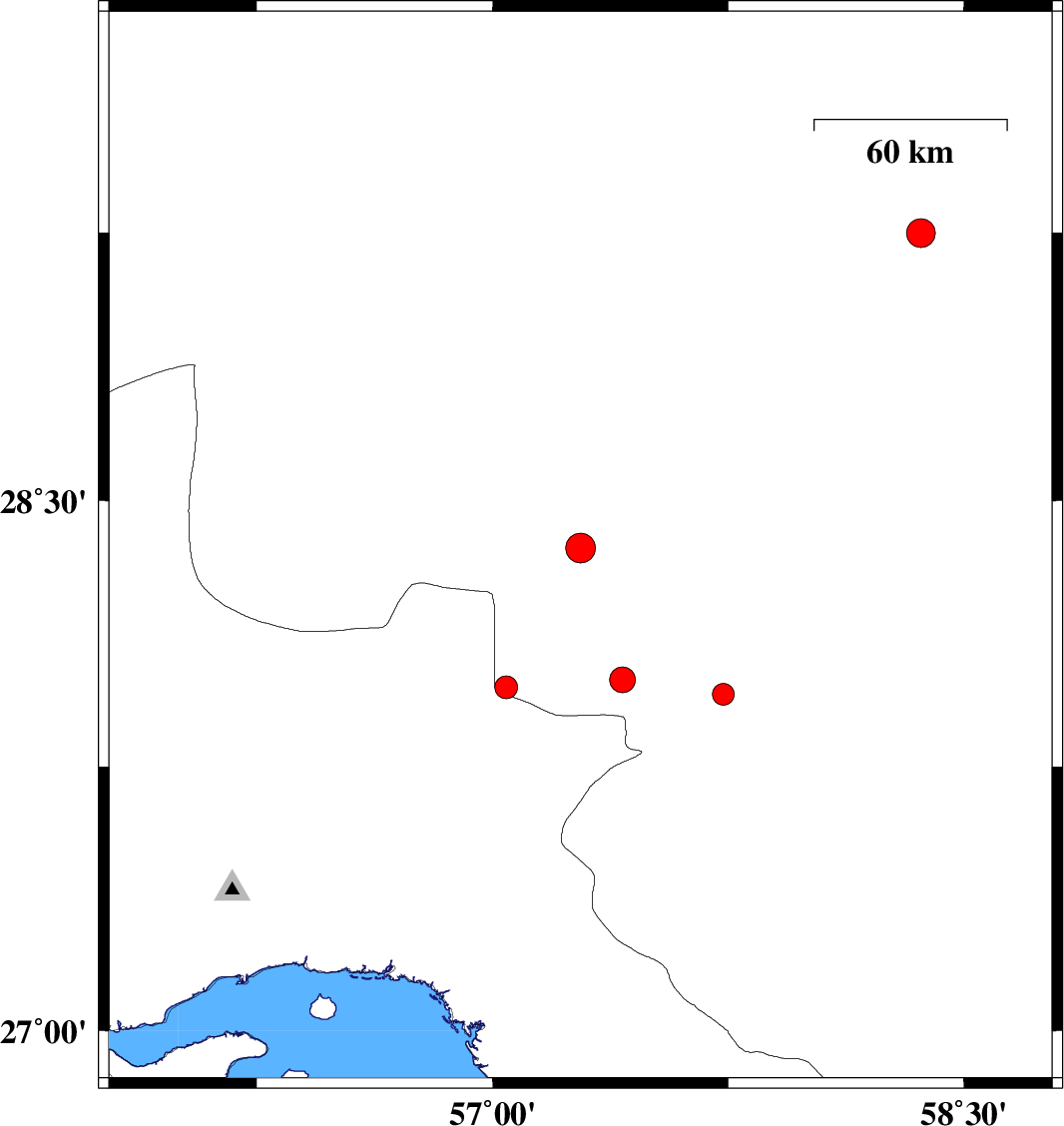 | 2017/03/20 | 23:44:47.2 | 03:14:47.2 | 27.974 | 57.044 | 14 | ML3.2 | Kerman Province, 64 km -West of Kahnuj | ||