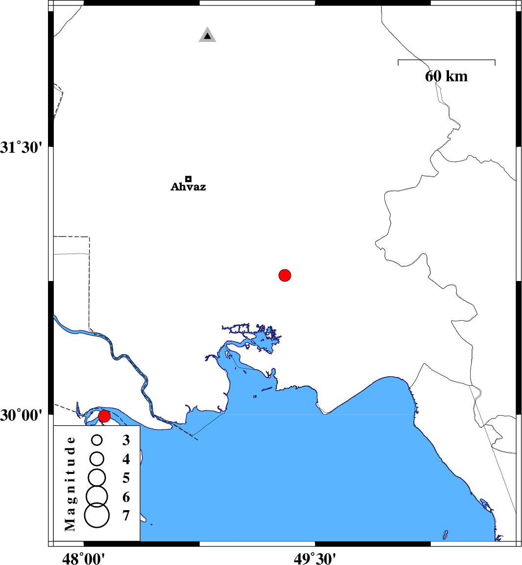 | 2017/03/19 | 22:36:36.0 | 02:06:36.0 | 29.991 | 48.133 | 15 | ML3.5 | Persian Gulf, 49 km South of Khorramshahr |