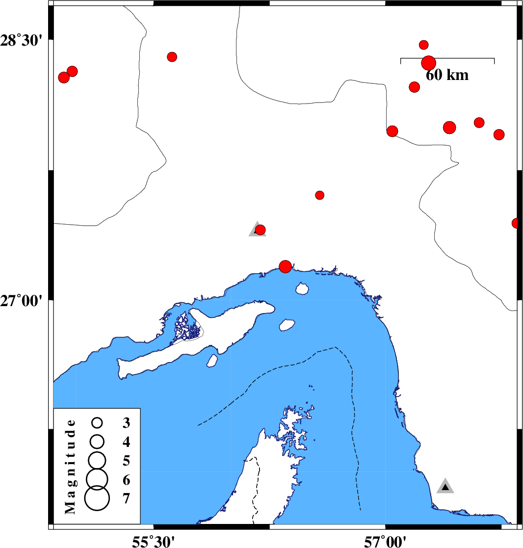 2017/03/08 | 05:00:11.1 | 08:30:11.1 | 28.227 | 57.187 | 16 | ML3.1 | Kerman Province, 59 km North-West of Kahnuj |