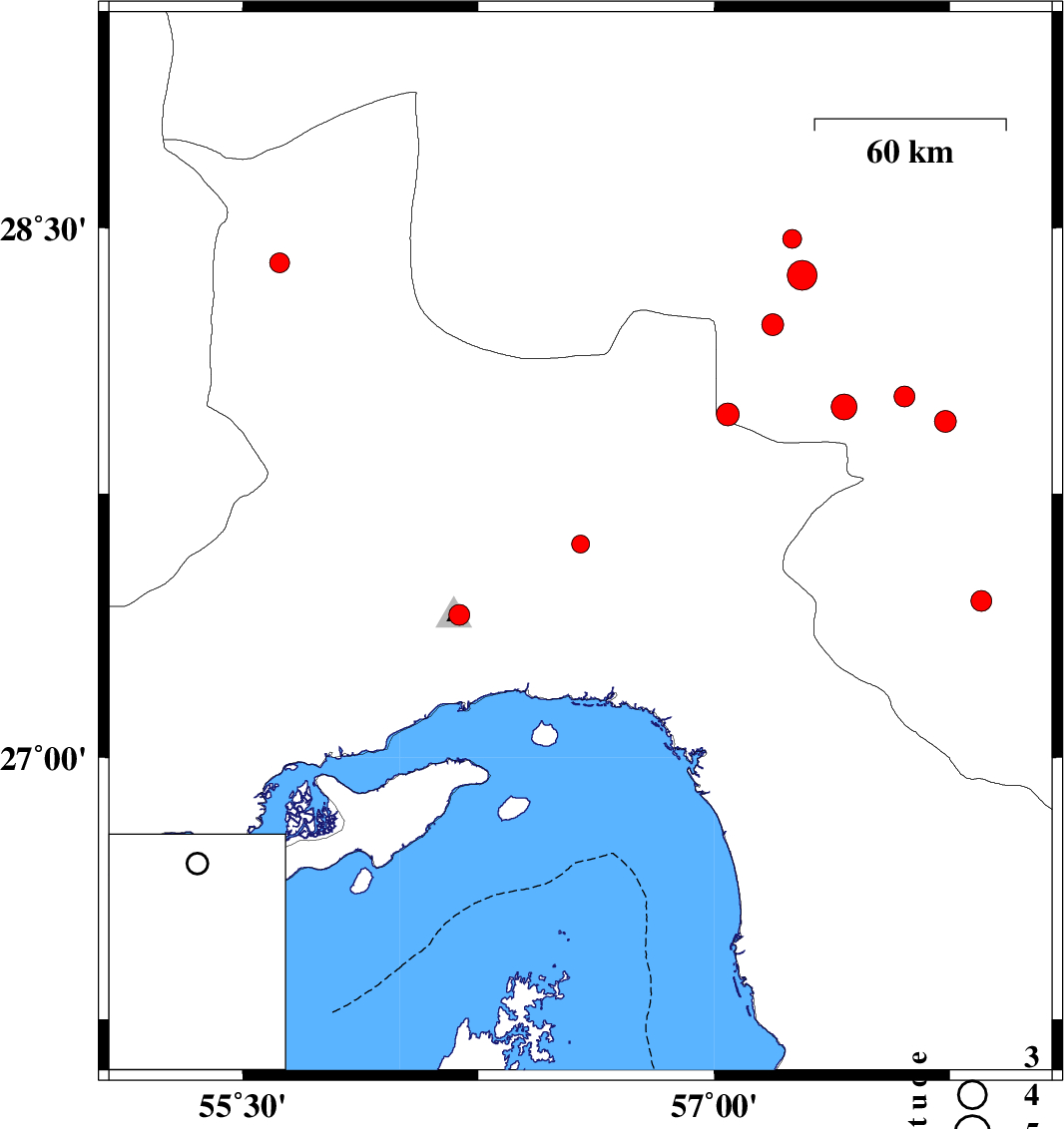 2017/03/08 | 05:00:11.1 | 08:30:11.1 | 28.227 | 57.187 | 16 | ML3.1 | Kerman Province, 59 km North-West of Kahnuj |