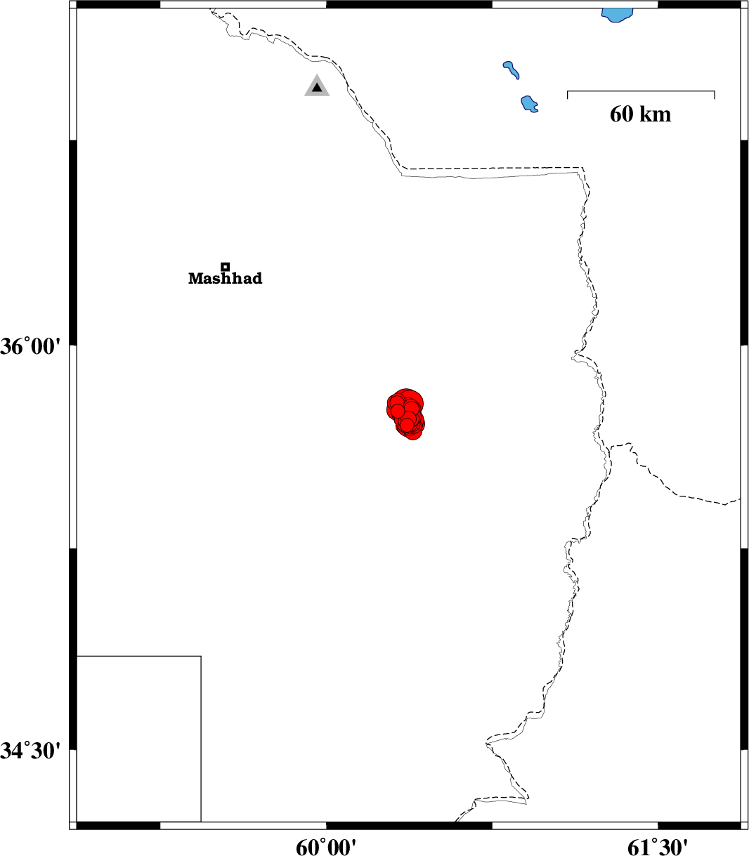 | 2017/04/08 | 04:02:43.3 | 08:32:43.3 | 35.71 | 60.391 | 15 | ML3 | Khorasan(center) Province, 49 km -East of Fariman | ||