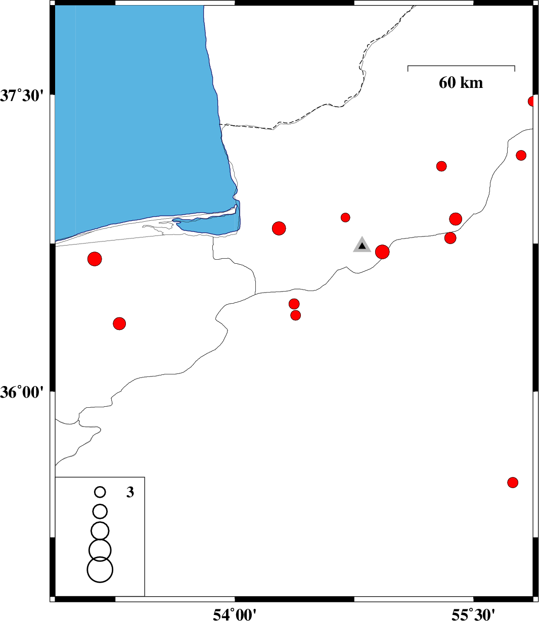| 2017/03/20 | 09:17:14.1 | 12:47:14.1 | 36.672 | 53.12 | 15 | ML4 | Mazandaran Province, 13 km North of Sari | ||