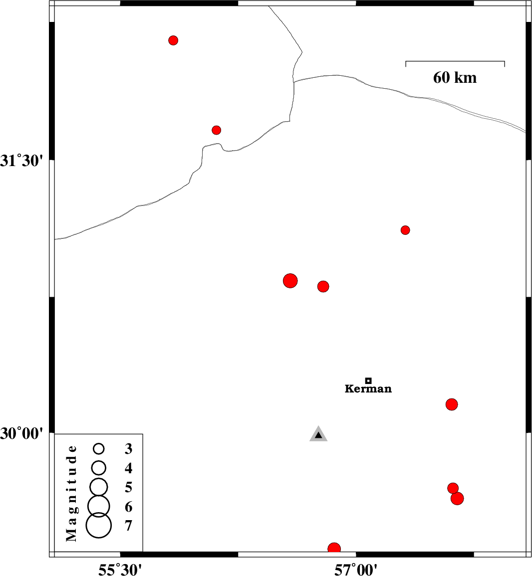 2017/04/02 | 14:29:52.1 | 18:59:52.1 | 29.692 | 57.617 | 14 | ML3.1 | Kerman Province, 84 km South-East of Kerman | ||