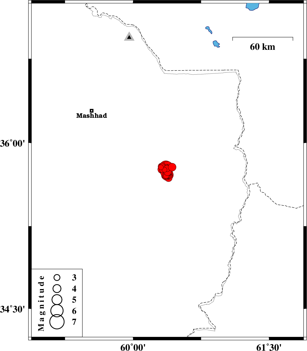 | 2017/04/08 | 04:02:43.3 | 08:32:43.3 | 35.71 | 60.391 | 15 | ML3 | Khorasan(center) Province, 49 km -East of Fariman | ||