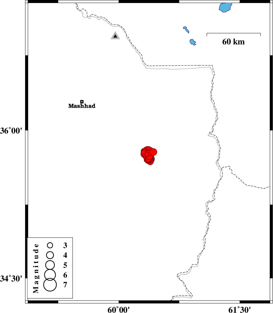 | 2017/04/08 | 04:02:43.3 | 08:32:43.3 | 35.71 | 60.391 | 15 | ML3 | Khorasan(center) Province, 49 km -East of Fariman | ||