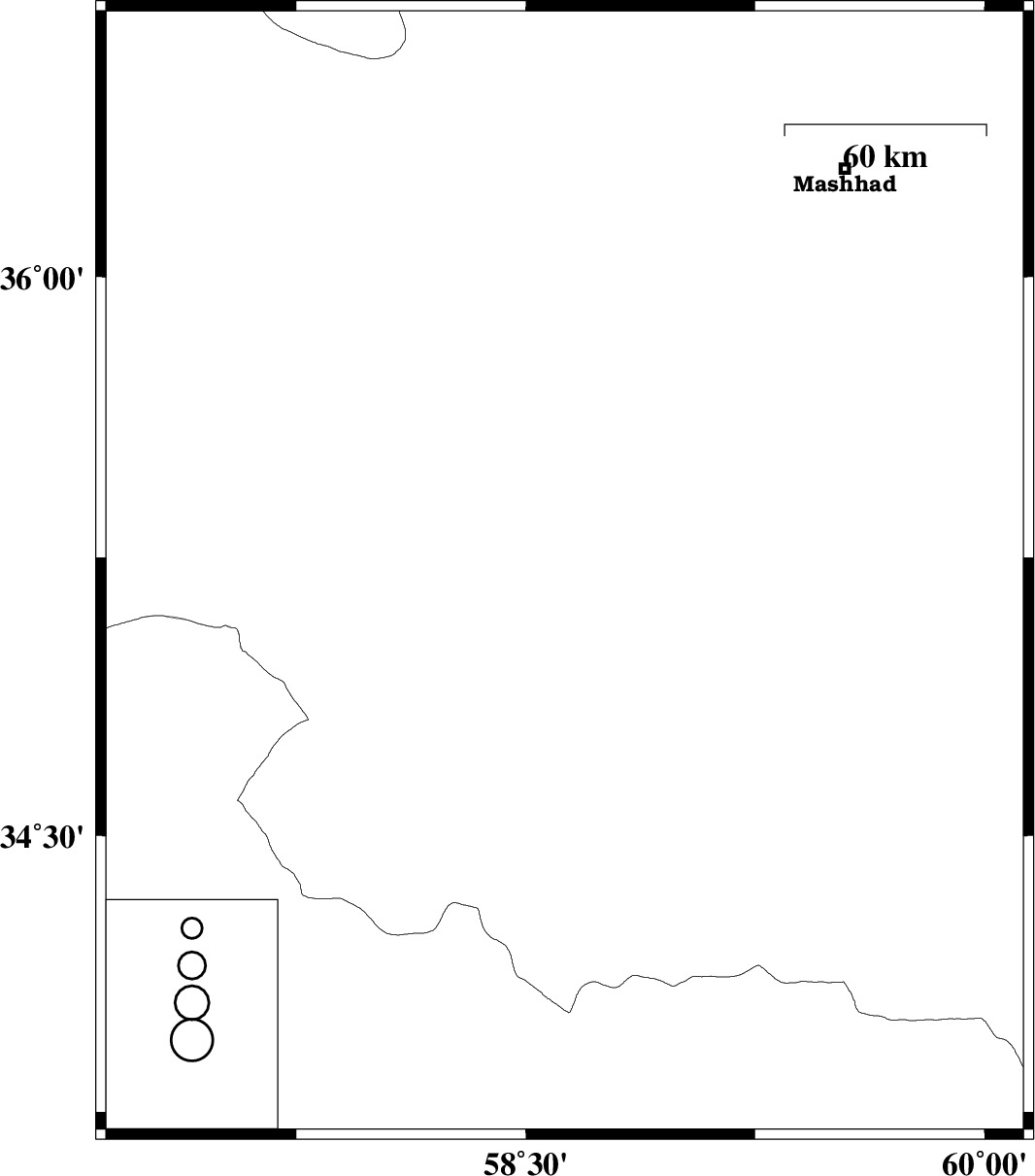| 2017/04/13 | 15:29:10.2 | 19:59:10.2 | 35.203 | 58.627 | 15 | ML3.2 | Khorasan(center) Province, 16 km -East of Kashmar |